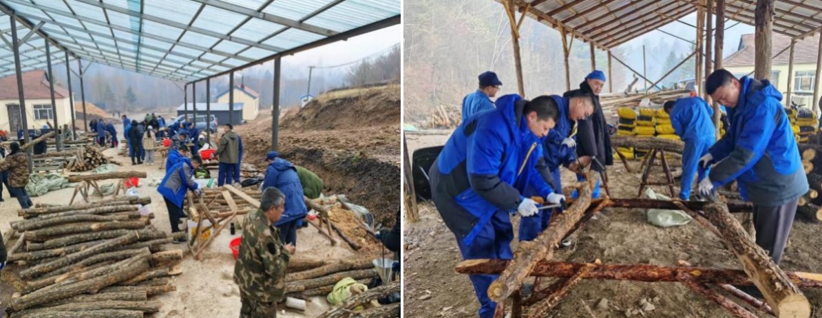 1.春雨礪鋒:4月27日,出征車隊(duì)劃破延邊晨霧,49名“特種兵”在淅瀝春雨中開(kāi)啟戰(zhàn)略急行軍。車廂化作移動(dòng)指揮部,此起彼伏的菌種活性研討與窗外雨打白樺的韻律共振;泥濘戰(zhàn)場(chǎng)里,“菌袋運(yùn)輸連”在濕滑坡道走出之字陣型,“菌架工兵排”于泥沼中架設(shè)鋼鐵矩陣。午間休整時(shí),水餃化作蒸汽騰騰的“戰(zhàn)地炊煙”,為下午的攻堅(jiān)戰(zhàn)儲(chǔ)備熱能。